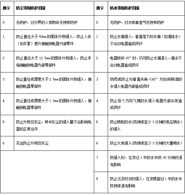 下面表格,簡要標明了IP防護等級標準。