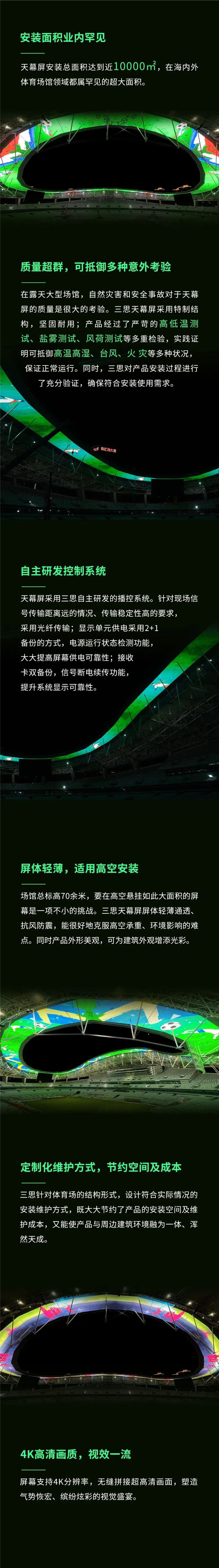 上海三思以強(qiáng)大的研發(fā)及定制能力,為上海體育場(chǎng)提供了巨型天幕屏。近10000㎡的面積,全球亦屈指可數(shù),這在海內(nèi)外的體育場(chǎng)館領(lǐng)域中,都屬罕見(jiàn)超大面積和超強(qiáng)工藝!