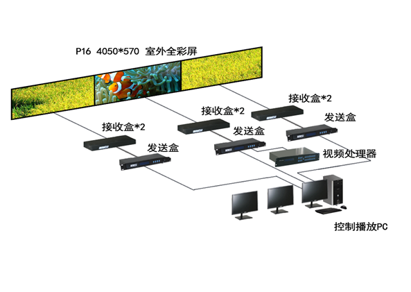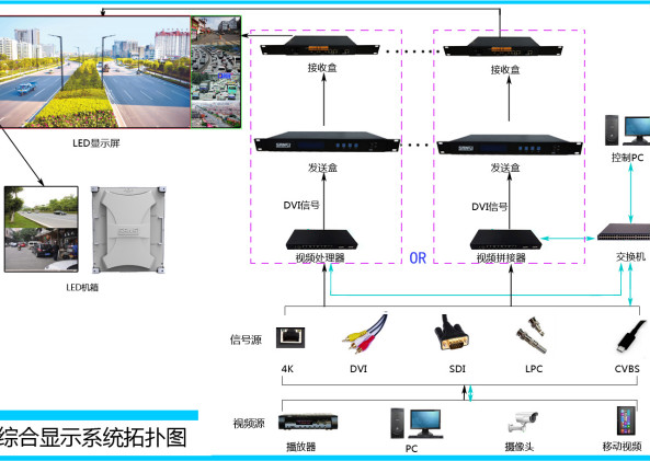 LED顯示控制系統主要包括:V3發送盒(發送卡,Sender),V3接收盒(接收卡,Receiver),V3掃描板(Scan board),V3架構,視頻處理器,視頻拼接器。