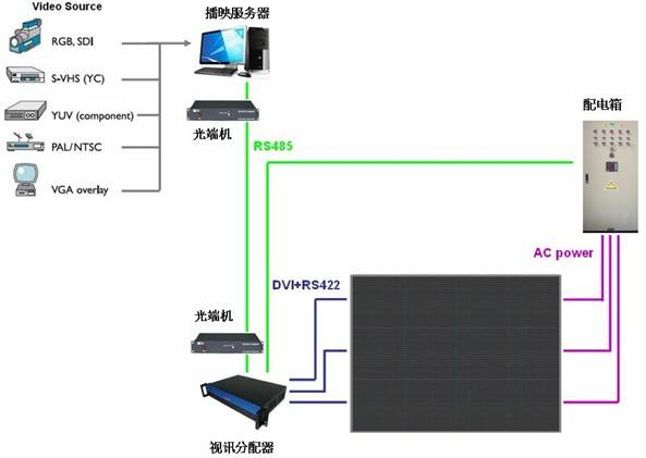 LED顯示配電系統,通常情況下顯示屏用電功率≤5kw可采用 AC 220V,即單相三線制供電;通常情況下屏體總用電功率≥5kw建議采用 AC 380V,即三相四線制或三相五線制供電。